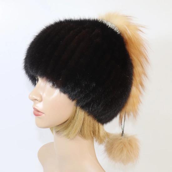 Новая женская вязаная шапка из натурального меха норки с лисьим хвостом, роскошного качества, шапка из натурального меха норки, женская зимняя теплая шапка из натурального меха норки Good elastic