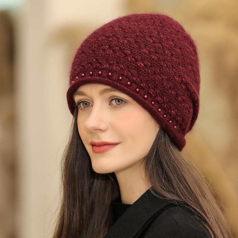 Новая женская зимняя шапка, уличная модная теплая шапка-бини для женщин, повседневная вязаная шапка с жемчужным украшением 55cm-58cm вино красного