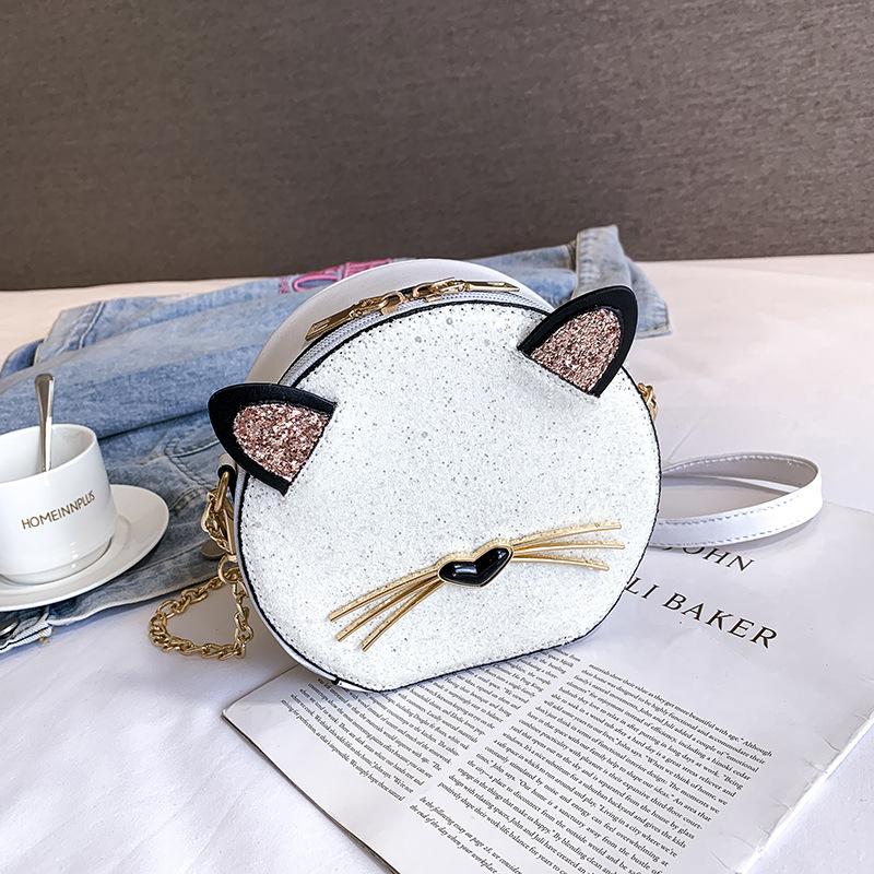 Новая женская сумка с блестками, маленькая круглая сумка с изображением кота, женская модная сумка через плечо, маленькая корейская версия, женская сумка, сумка-мессенджер, универсальная белый