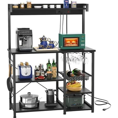 fangbisou Bakers Rack with Power Outlet Microwave Stand Kitchen Storage Shelf with Wire Basket Coffee Bar Station with Wine Glass Holder 35.4 Kitchen Rack for Spices Pots and P