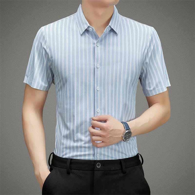 Новая летняя полосатая приталенная рубашка с короткими рукавами и лацканами, мужская тонкая деловая рубашка для молодежи и среднего возраста M