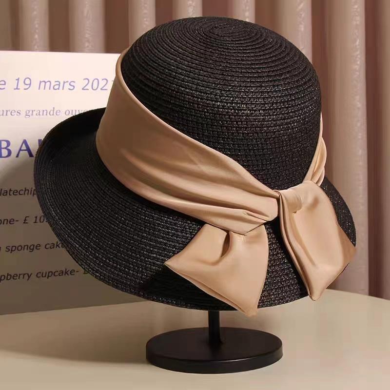 Новая летняя соломенная шляпа с козырьком и бантом для отдыха на открытом воздухе, женская гофрированная шляпа-ведро, складная пляжная шляпа от солнца на берегу моря M(56-58cm) чёрный