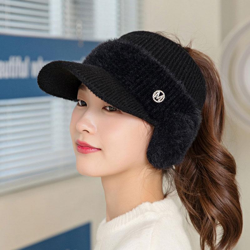 Новая модная женская вязаная флисовая шапка осень-зима с ушами, бейсболка с пустым верхом для женщин Adjustable чёрный