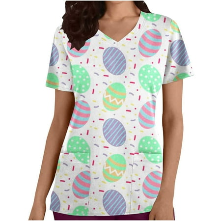 REORIAFEE Women Cute Bunny Scrub Tops Working Uniform Short Sleeve V-Neck Tops Workwear Easter Day Rabbit Print Blouse Easter Sale Tropical Tops Photoshoot Shirt Green XL