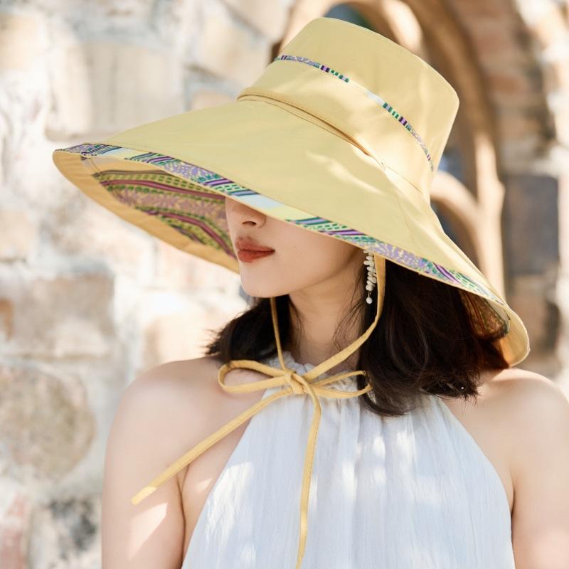 Новая этническая складная двусторонняя шляпа-ведро, шляпа от солнца с очень широкими полями, дорожная, для отпуска, защита от УФ-лучей, шляпа от солнца One size жёлтый