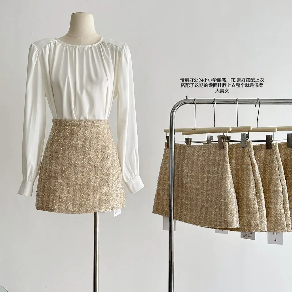 Новая юбка-трапеция с высокой талией Lauri Laki, Женская винтажная желтая мини-юбка с блестками, осень 2023