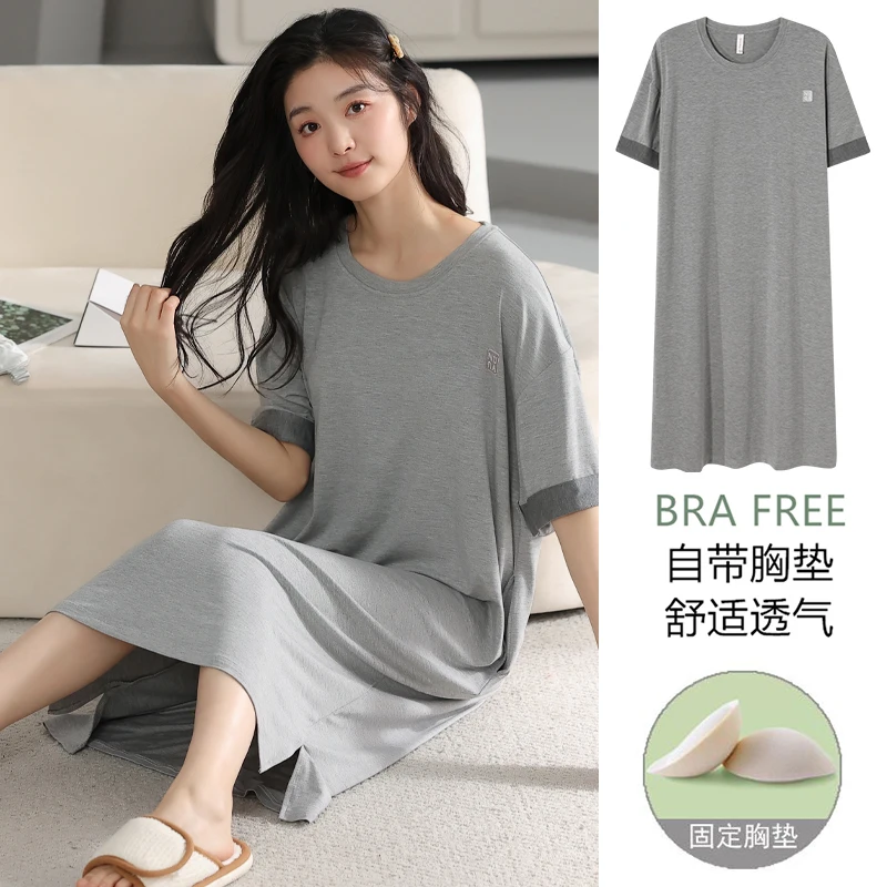 Новейшая женская ночная рубашка с коротким рукавом и накладкой на грудь, Женская Однотонная ночная рубашка