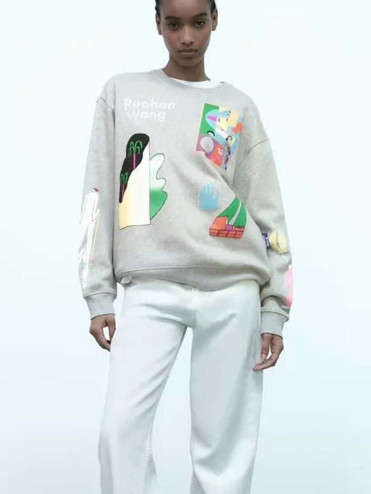 Новинка Лето 2023 женская одежда Свободный Повседневный свитер с круглым вырезом и длинными рукавами с принтом манга вышивка с буквами