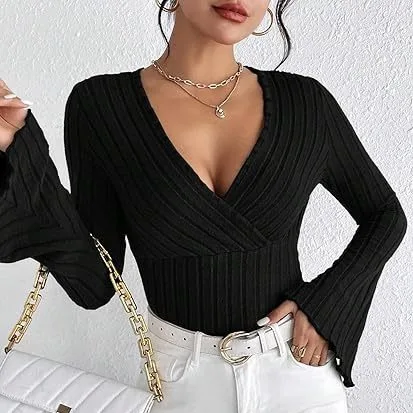 Новинка Осень-зима 2024, женская блузка в рубчик с V-образным вырезом и длинными рукавами