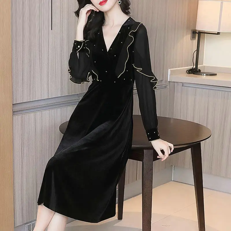 Новинка весна-осень 2022 Черное женское платье из иностранного золота бархатное платье с оборками повседневное вечернее вечерние с V-образны...