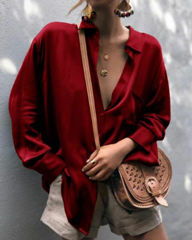 Women Sexy Deep V-neck Satin Blouse Tops Casual Long Sleeve Office Ladies Shirt, Blue