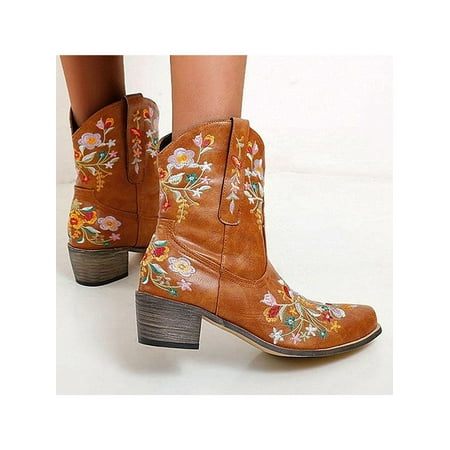 Audeban Womens Cowboy Boots Embroidery Cowgirl Western Low Block Mid Calf Riding Boots
