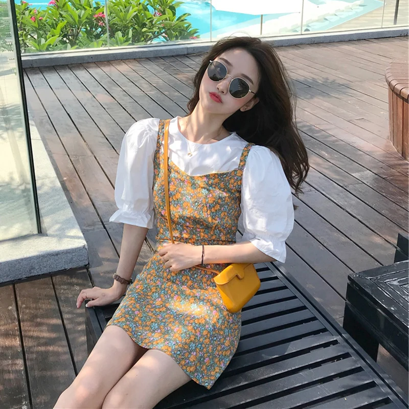 Новинка лета 2021, женская одежда, летнее платье на бретелях с цветочным принтом, модный костюм из двух предметов в стиле ранней весны с пышным...