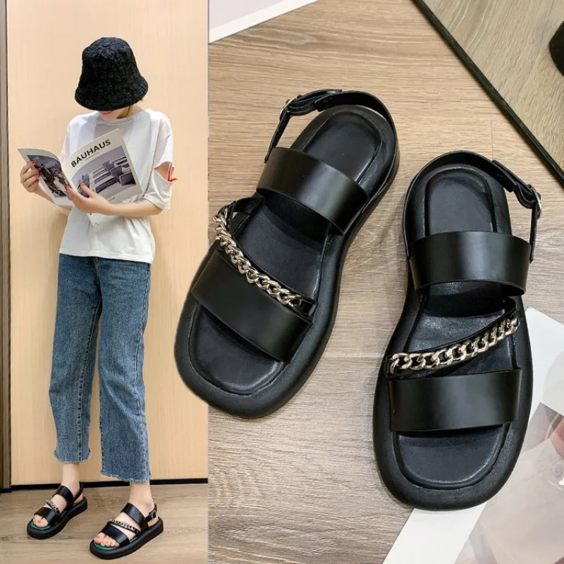 Новинка лета 2023, повседневные модные студенческие спортивные сандалии в Корейском стиле с цепочкой и ремешком с пряжкой для одно слово