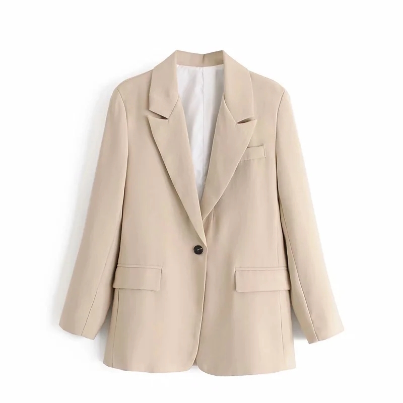 2021 New Vintage Ladies Pocket Suits Autumn Cream Feminine Fashion Plain-button Female Casual Jackets Girls Notched Jacket XPE5, Beige