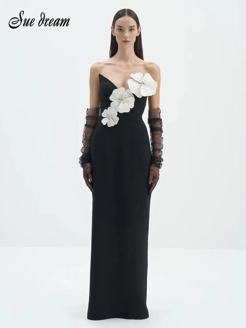 Новинка лета 2024, женское шикарное платье с красивым цветочным дизайном, со стразами, без бретелек, без рукавов, черное Бандажное платье, Модное Длинное Платье
