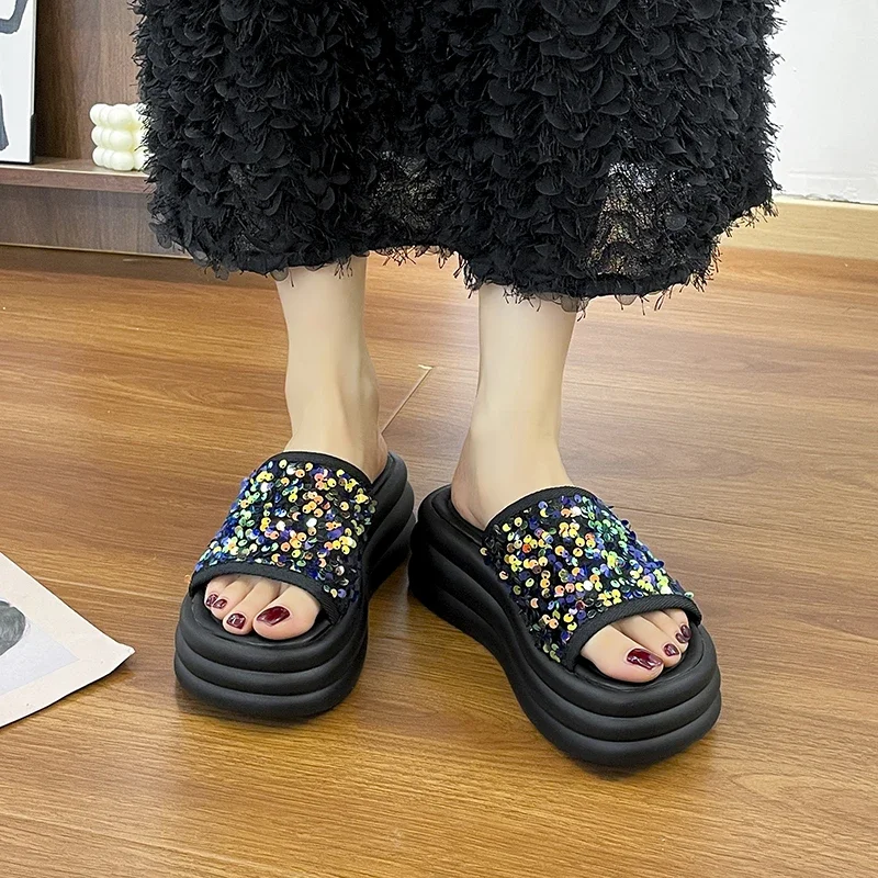 Новинка лета 2024, модная женская обувь, Повседневные тапочки на толстой подошве, с блестками, с закрытым носком и плоской подошвой