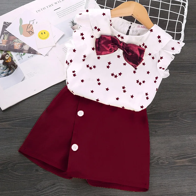 Новинка, летняя повседневная одежда для девочек, топ с летящим рукавом и принтом звезд и оборками + модная короткая юбка на пуговицах, компле...