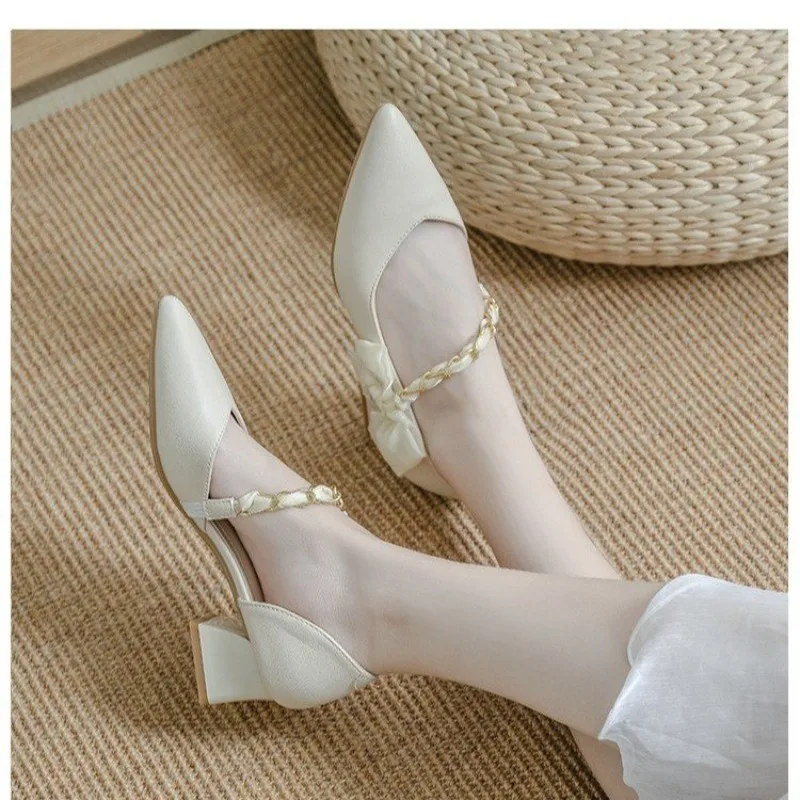 Новинка, модная женская летняя обувь BCEBYL с острым неглубоким закрытым бантом и металлической цепочкой, Элегантные повседневные туфли на высоком каблуке