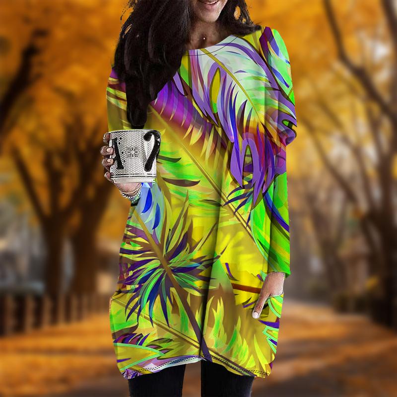 Новинка осени масляная живопись перья принт платье размера плюс женские O-образный вырез длинные рукава повседневные карманные платья 8XL жёлтый