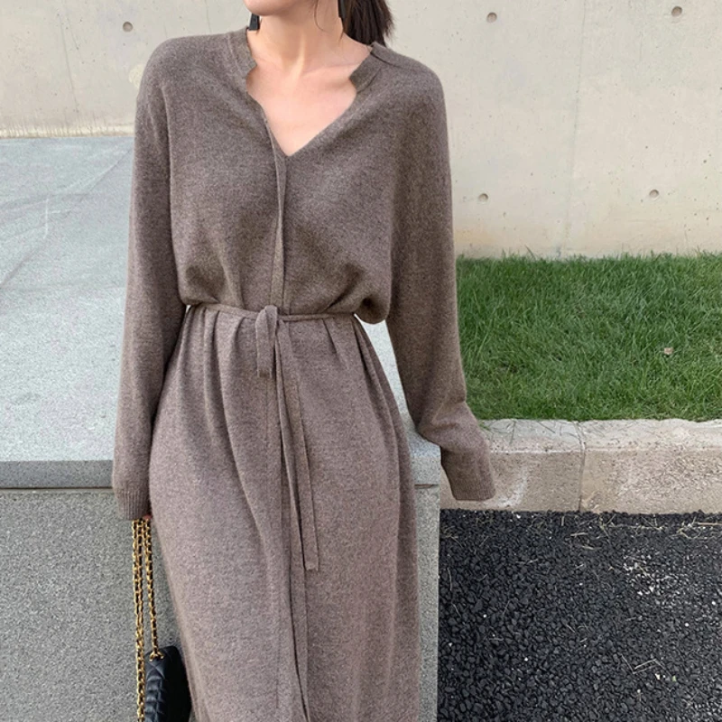 Новинка осени 2023, женское вязаное длинное платье-свитер, элегантное винтажное облегающее платье-свитер в французском стиле с завязкой на талии