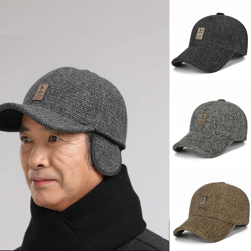 Новинка, шерстяная вязаная бейсболка, зимние плотные теплые шапки с ушами, универсальные Спортивные Повседневные хлопковые шапки для пожил...