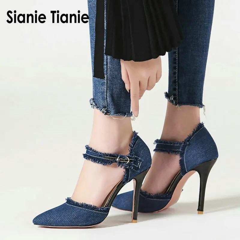Новинка 2020, модные женские туфли-лодочки QPLYXCO с острым носком, летние туфли из денима на высоком каблуке 10 см, летние женские классические свадебные туфли, сандалии
