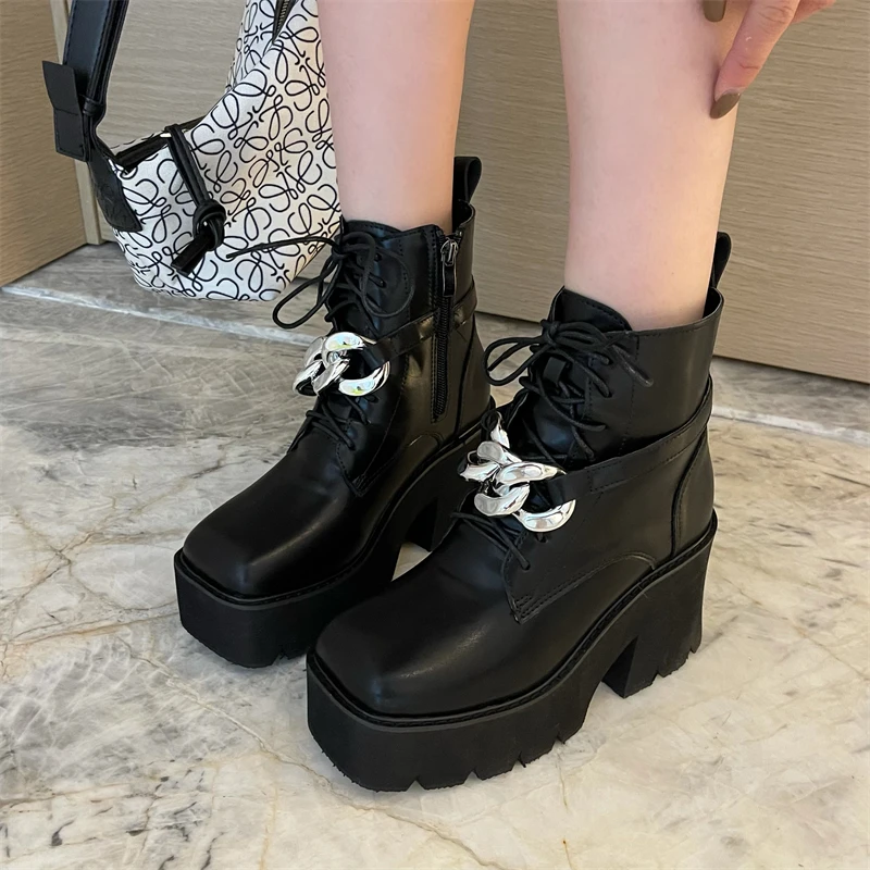 Новинка 2021, модные ботинки Martin, женские ботинки с металлическим квадратным носком на платформе и высоком каблуке