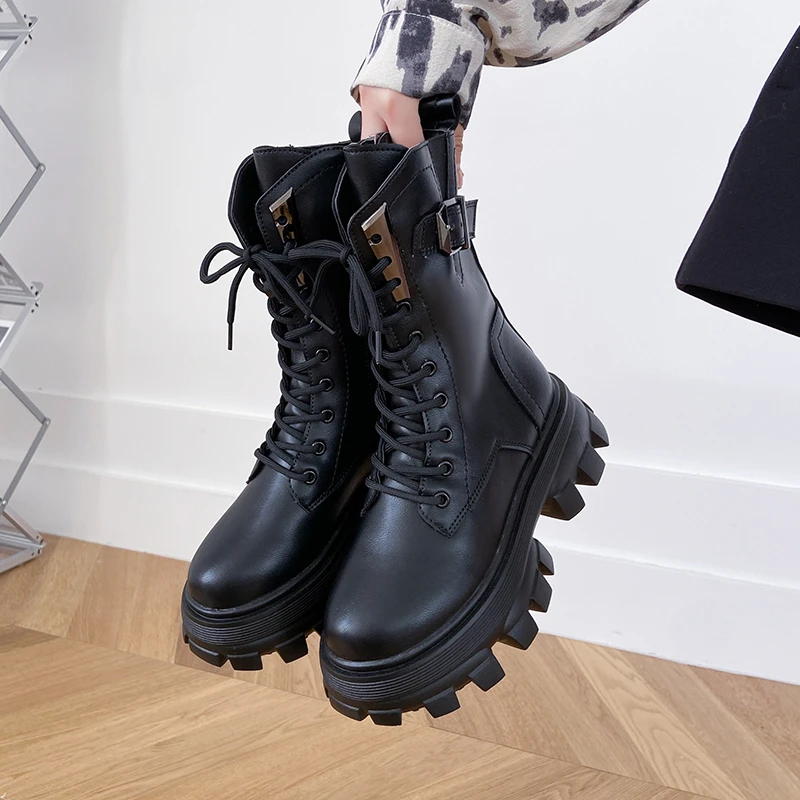 Новинка 2022, женские ботинки из искусственной кожи, сапоги с круглым носком на массивном каблуке, обувь на платформе, женские зимние ботинки ...