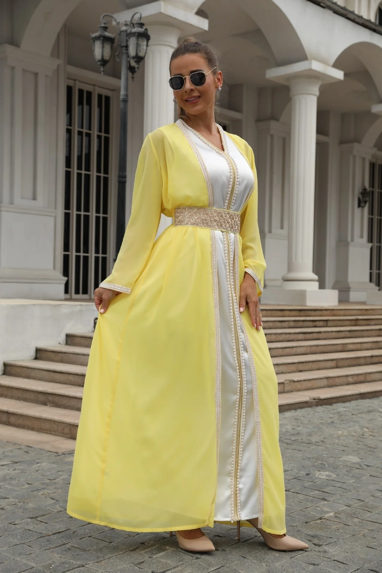 Новинка 2022, женский длинный желтый костюм mslalb из 2 предметов с поясом и украшением из жемчуга