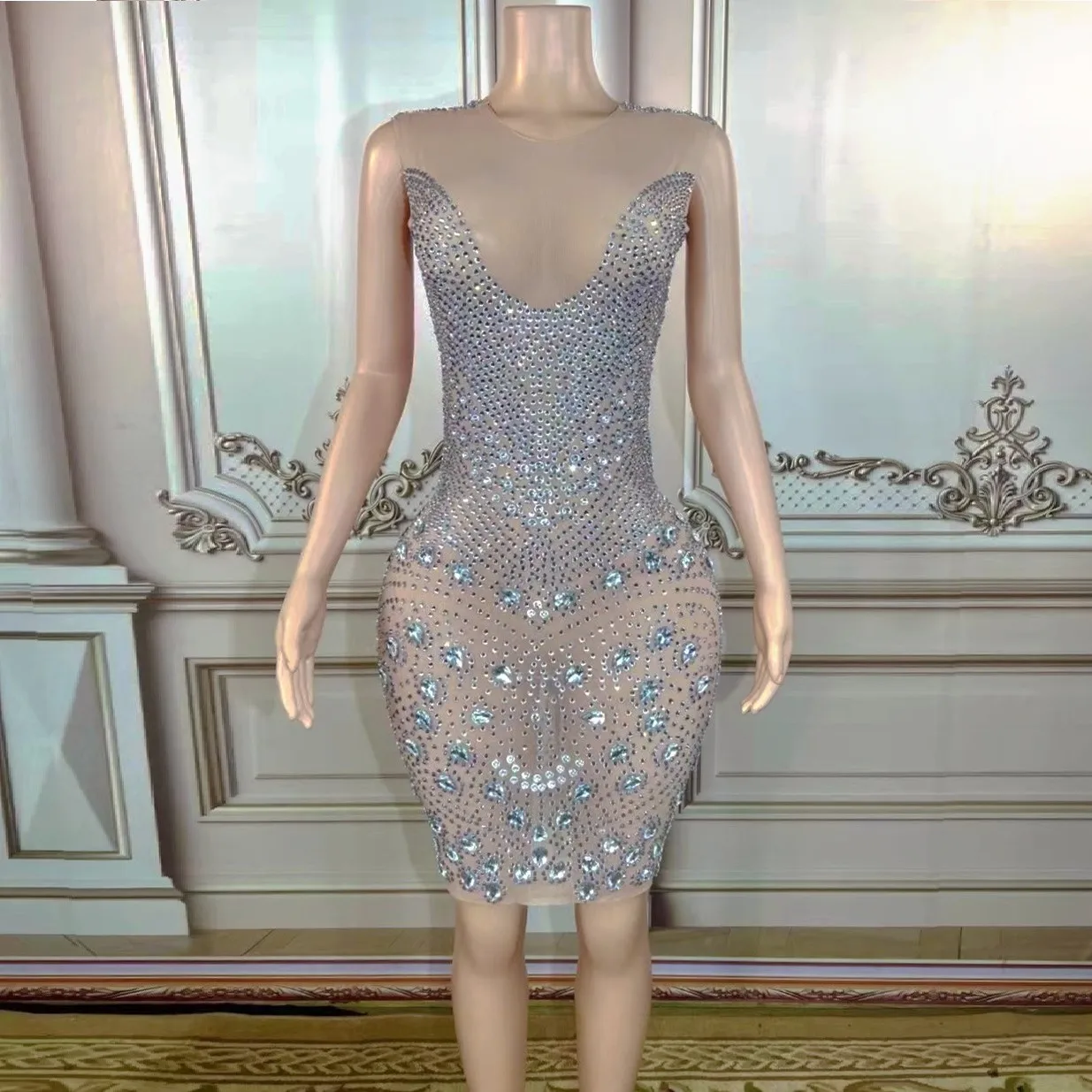 Новинка 2022, летнее женское сексуальное облегающее мини-платье без рукавов, блестящее стразы, костюм для празднования дня рождения, выступления, сценическая одежда