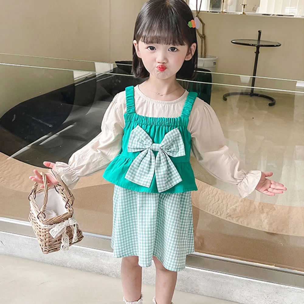 Новинка 2022, модное весенне-осеннее милое платье с бантом и жилеты, наряды, детская повседневная одежда, детская повседневная одежда из двух ...