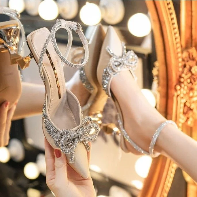 Новинка 2022, сетчатые красные туфли Стразы с бантом на высоком каблуке, женские туфли на тонком каблуке, с острым носком и ремешком на голову, ...