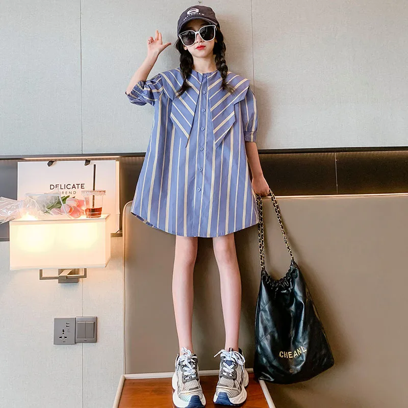 Новинка 2023, летние детские длинные платья-рубашки в стиле колледжа для девочек, детская одежда