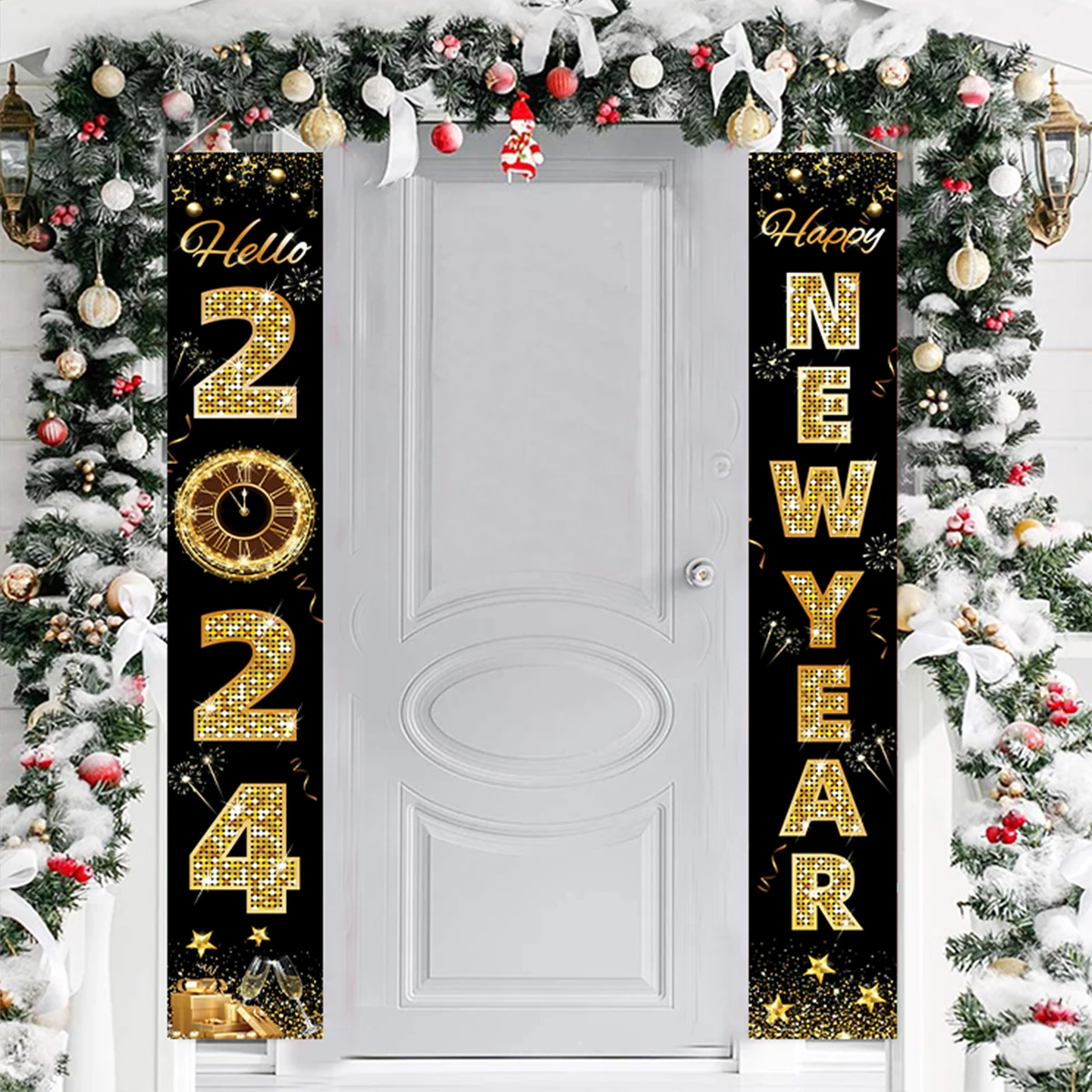 Новогодний баннер на дверь крыльца, знак, Висячие флаги черного и золотого цвета, украшение для улицы, Рождество 2024, товары для дома