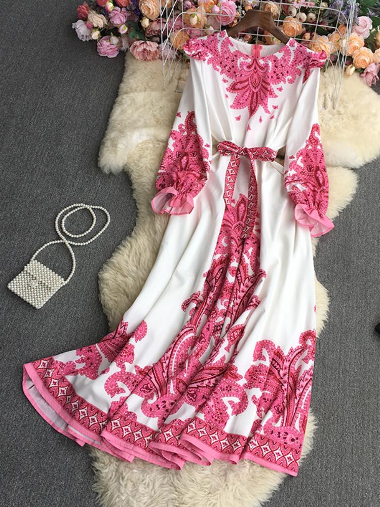 Новое весенне-осеннее длинное платье с принтом, женское модное платье с круглым вырезом и длинными рукавами на шнуровке, женские элегантные тонкие платья трапециевидной формы