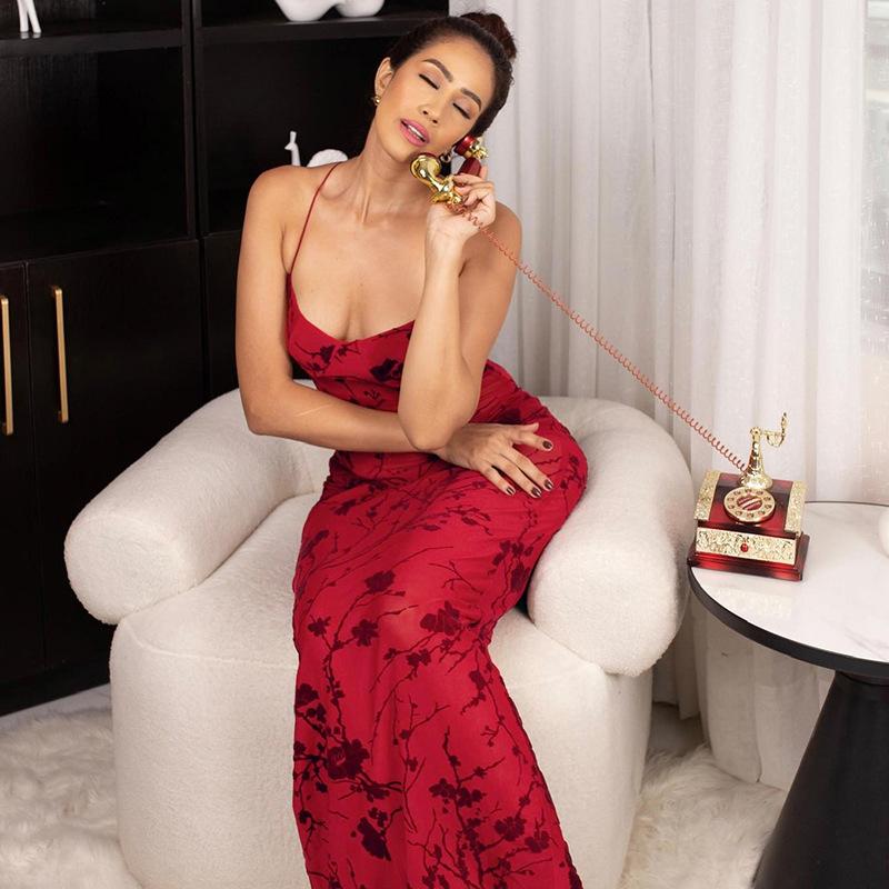 Новое женское винтажное платье с принтом, темпераментное тонкое платье с бретелькой на шее, женское платье, длинное платье, клубный стиль, пляжный стиль L красный