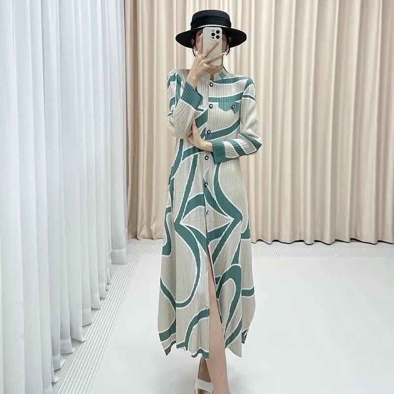 Новое осеннее плиссированное высококачественное темпераментное платье средней длины с длинными рукавами и принтом для платьев One Size хаки