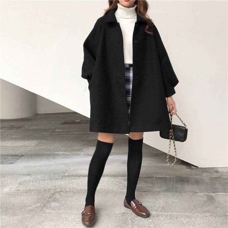 Новое поступление, осенне-зимняя шерстяная куртка для женщин, средней длины, корейский стиль, свободный крой, миниатюрное универсальное шерстяное теплое пальто S чёрный