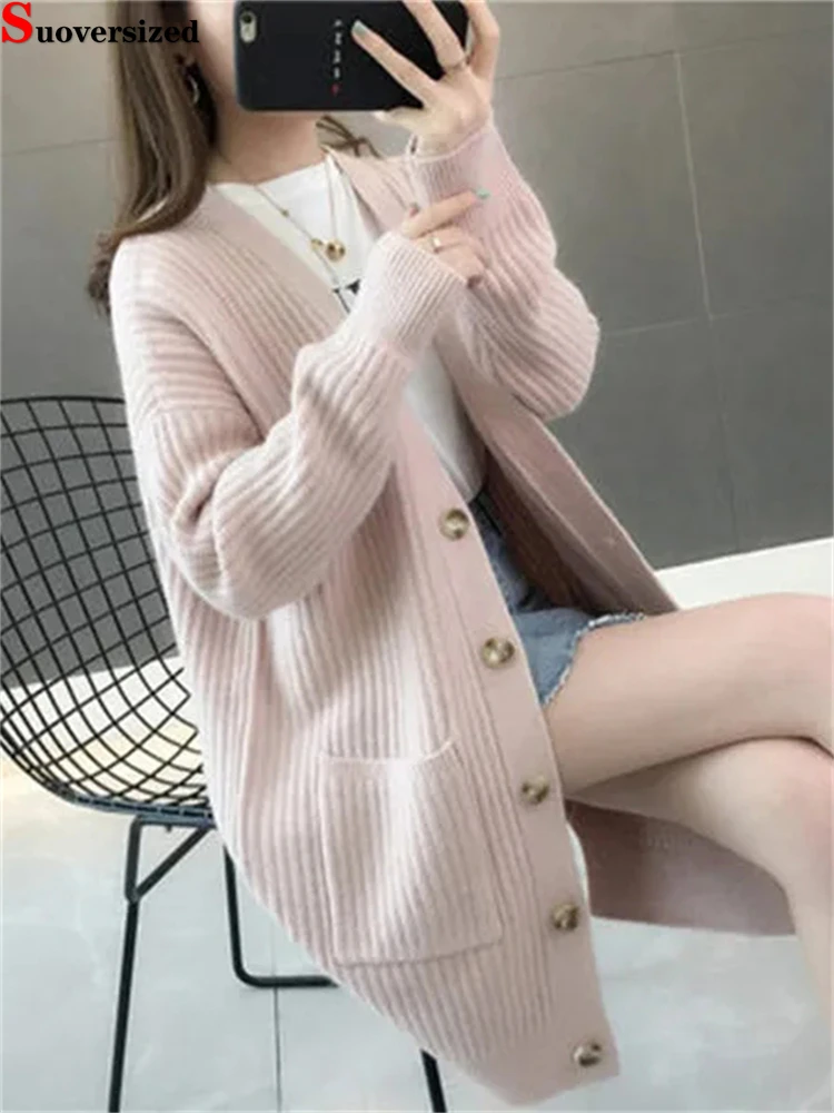 Вязаная одежда, Новый женский элегантный весенний свитер, свободные вязаные кардиганы средней длины, повседневные топы с длинным рукавом, корейская мода