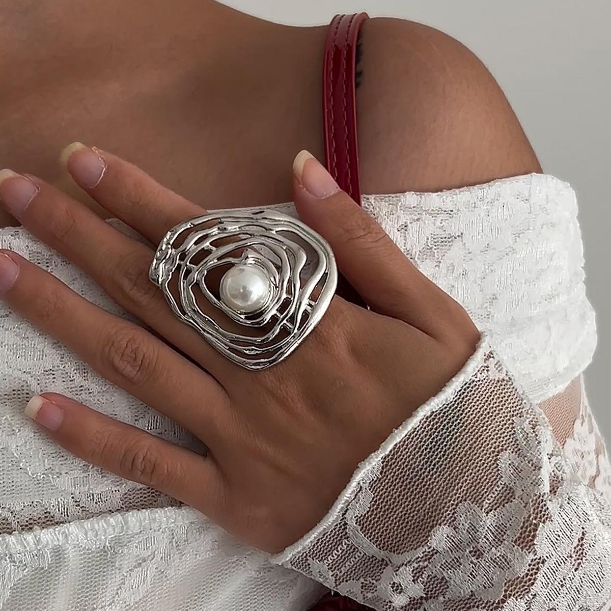 Новое преувеличенное металлическое плиссированное кольцо с имитацией жемчуга, персонализированное милое и прохладное открытое кольцо