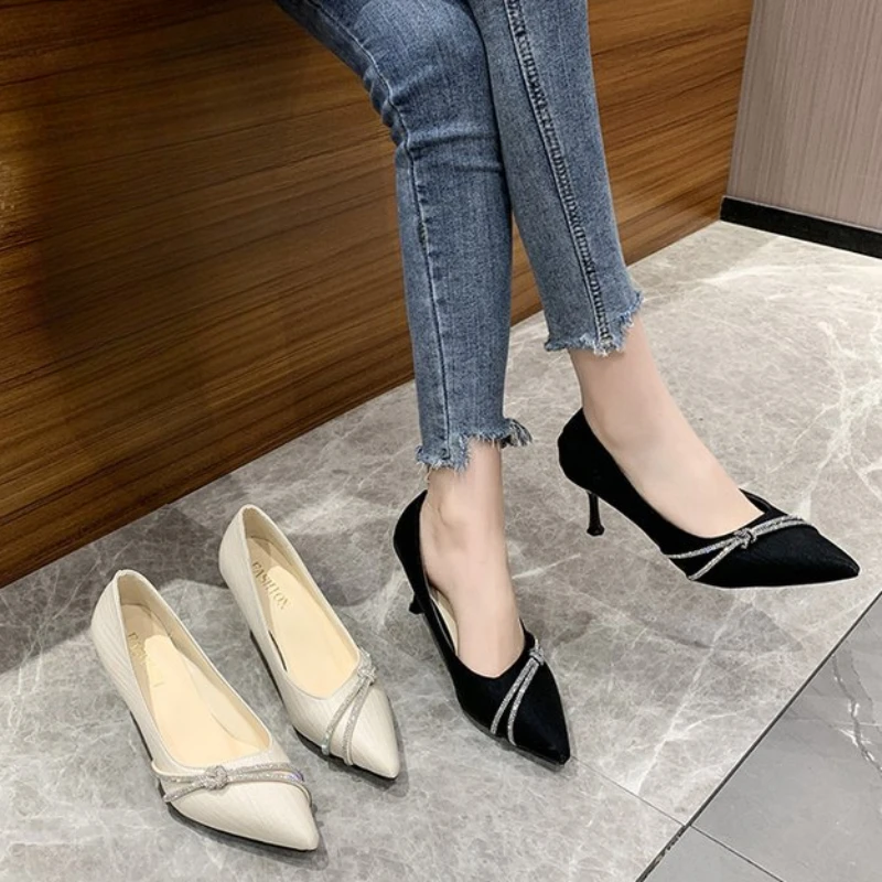 Новые Элегантные женские туфли с острым носком, украшенные искусственными элементами, однотонная модная Банкетная обувь с открытым носком и высоким каблуком