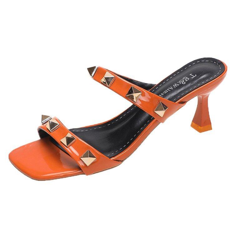 Новые босоножки на высоком каблуке с квадратной головкой и толстым каблуком, женская обувь с заклепками и пряжкой, весна-лето 39 оранжевый