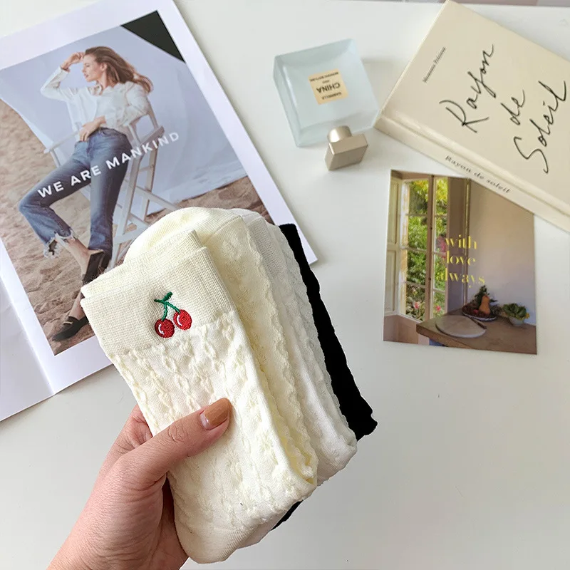 Новые весенние женские носки с вышивкой носки с вишней Sports, черные и белые, 3 цвета, клубника кавайные носки