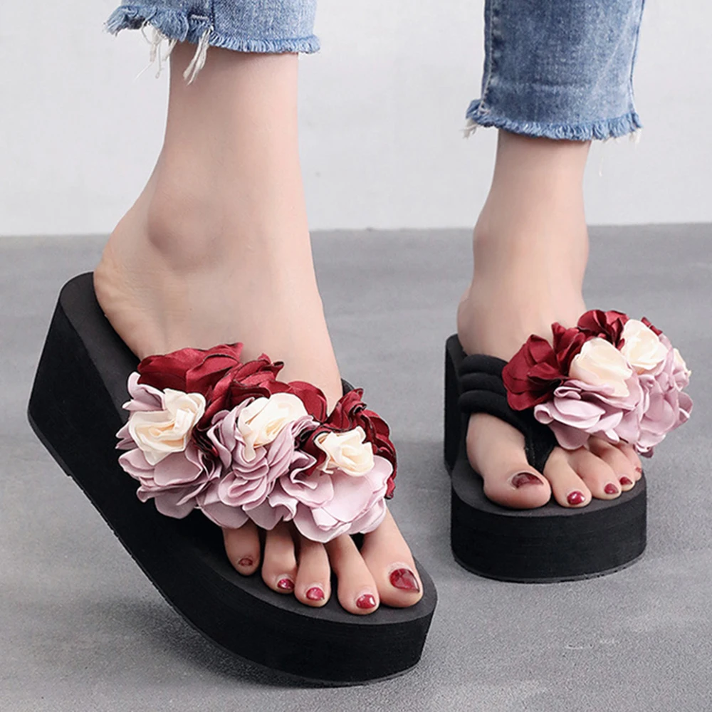 Новые женские тапочки с цветами, пляжная обувь для улицы, женские летние шлепанцы, плоские тапочки на платформе, женская обувь hh310
