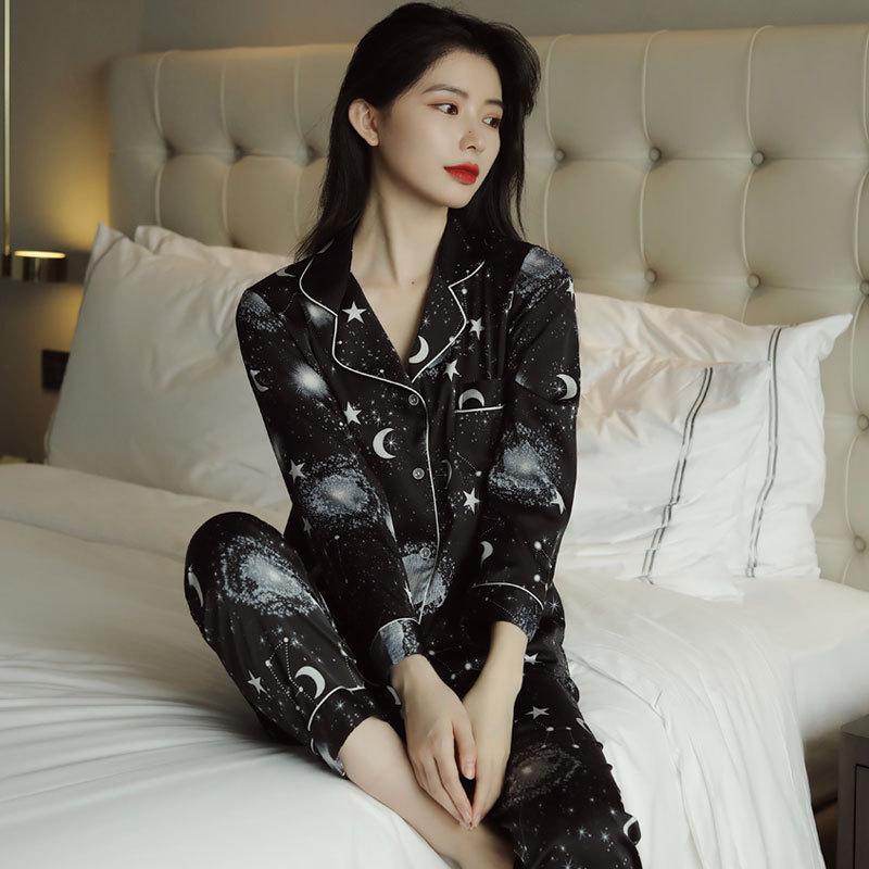 Новые летние пижамы, женские брюки с длинными рукавами, модные свободные повседневные костюмы из ледяного шелка, домашние служебные костюмы, можно носить шелк на улице XL чёрный