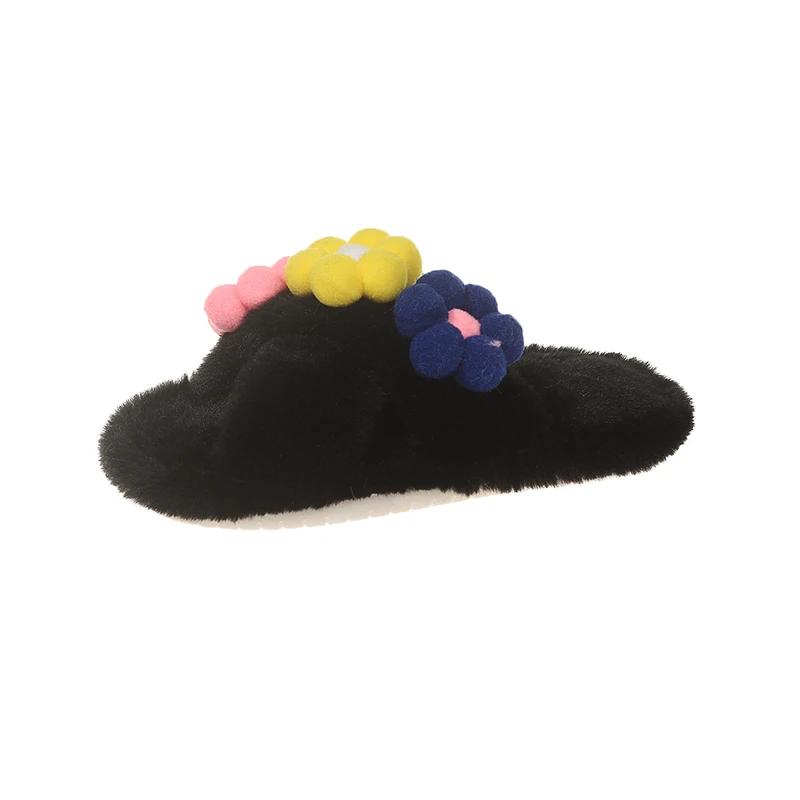 Новые милые зимние меховые тапочки для девочек, элегантные детские тапочки с цветочным принтом, теплые домашние тапочки для принцесс, модная мягкая универсальная детская повседневная обувь 30-31 чёрный