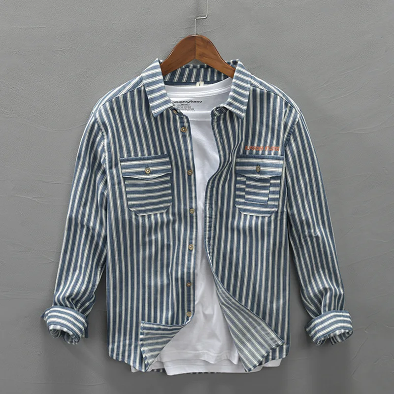 Новые осенние мужские рубашки в полоску с длинным рукавом из чистого хлопка, модные повседневные мужские топы с отложным воротником и накла...