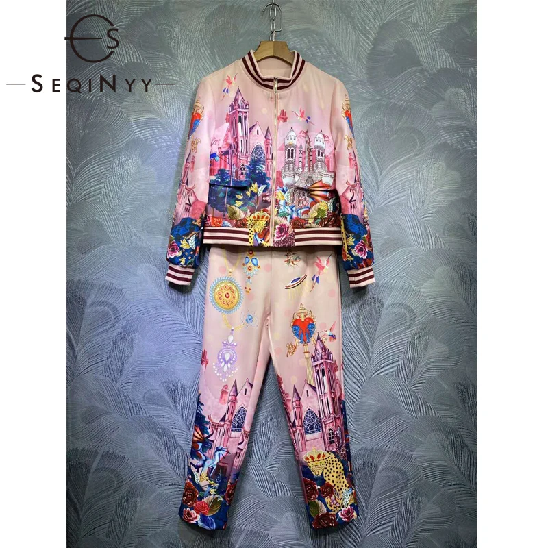 SEQINYY Vintage Pink Suit 2020 Spring Autumn New Fashion Design Women Runway Jacket + Midi Pants Castle Print Casual