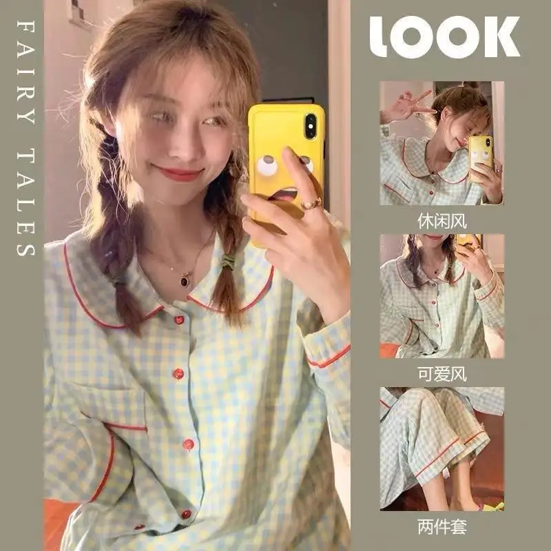 Новый весенне-осенний женский пижамный комплект из двух предметов в клетку с длинным рукавом милый домашний костюм в стиле Ins